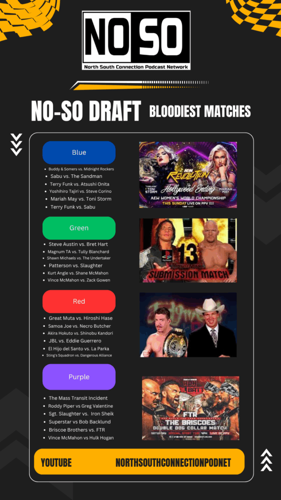 In this episode of NoSo Draft, hosts JT Rozzero & Ryan Gray welcome Rocco Martone & Chad Campbell to compete in a draft to build the best lineup of the Bloodiest Matches!